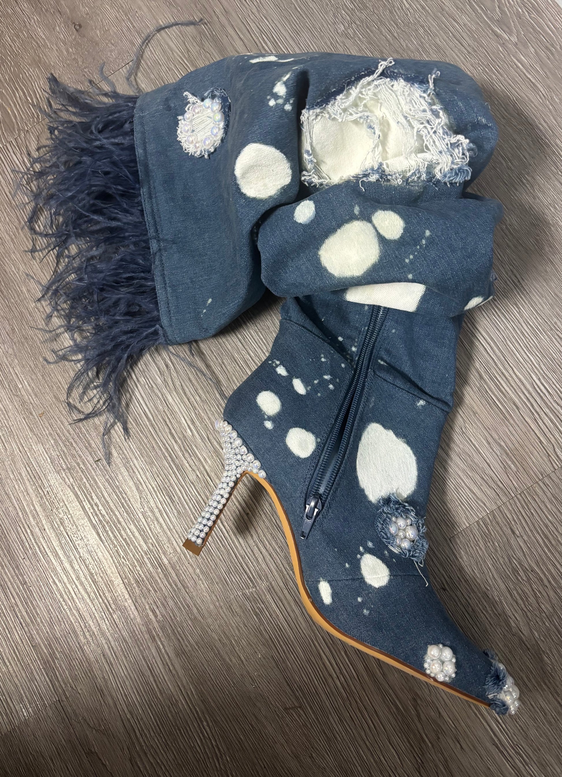 Denim knee high boot with a 3” heel mixed matched has bleached spots and distressed denim with pearls for an elegant/sassy look for any occasion. All boots are One of a Kind.