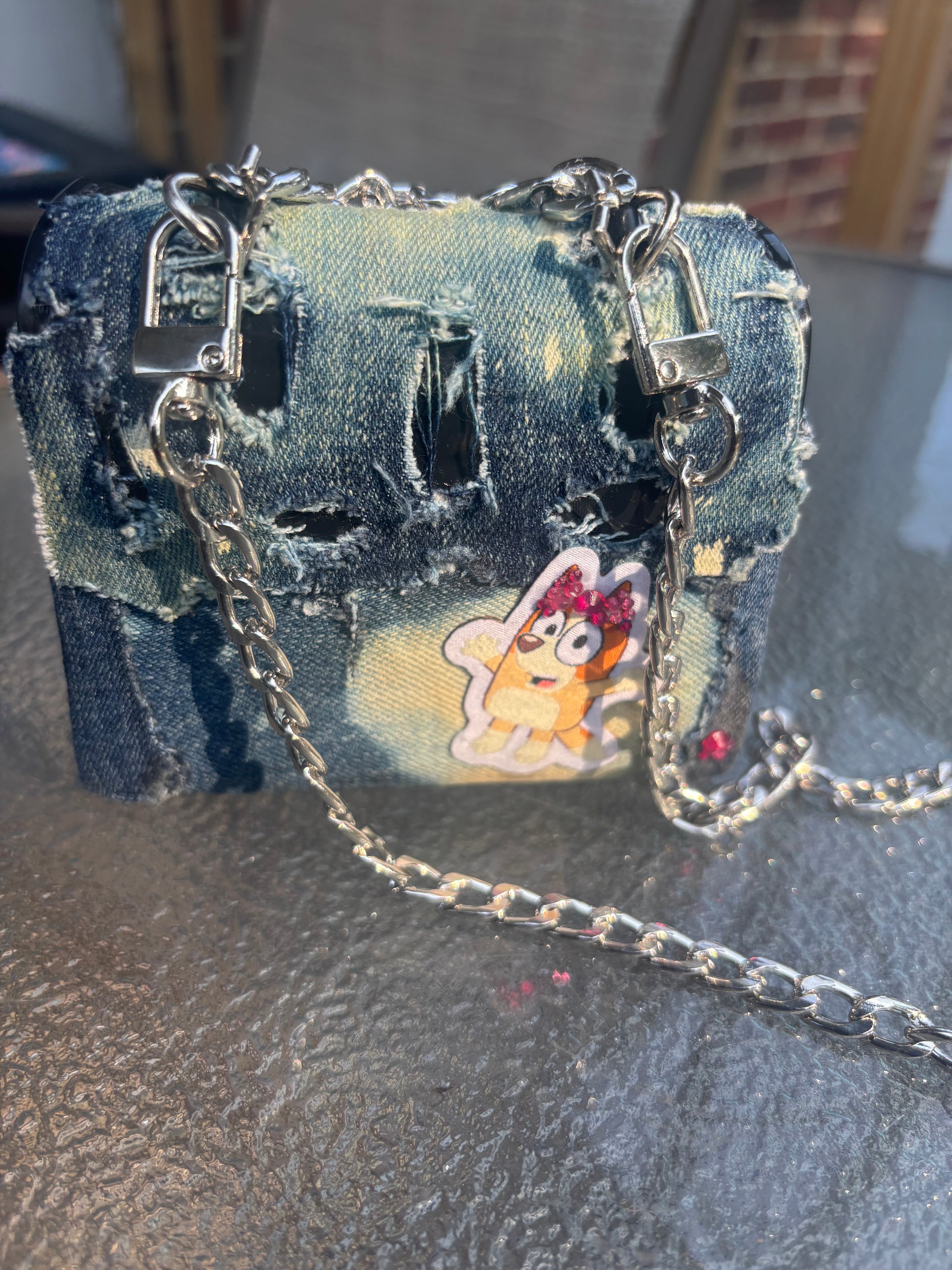 Denim purse perfect for toddlers 5 and under. This Mini has a handle and chain to wear as a crossbody. Custom with character of choice available.
